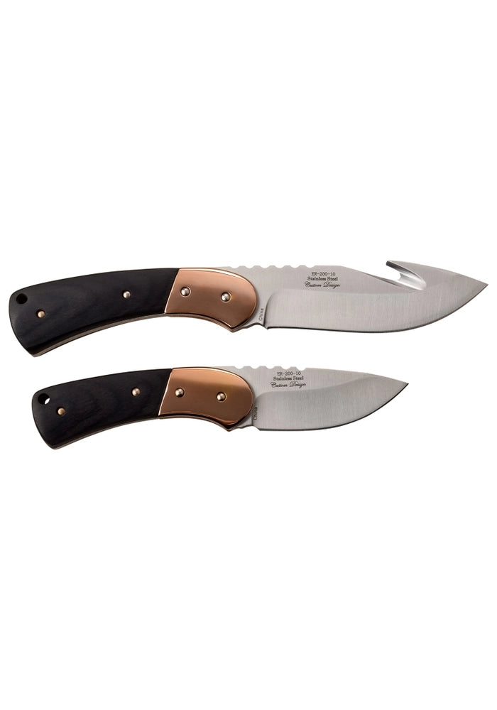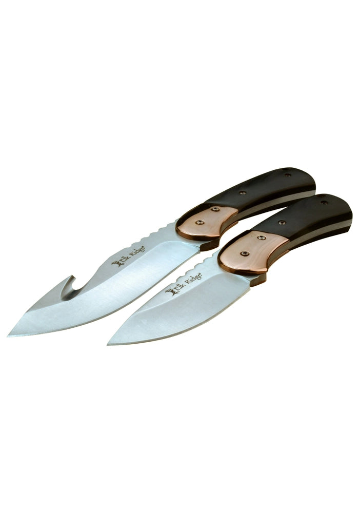 Crafted with durable stainless steel, the Elk Ridge Pursuit Combo features a full tang and a copper TiNite bolster for reliable performance. Its wood handle provides a comfortable grip, while the 3.75" gutting hook blade and 2.5" blade offer precise cutting. Includes a leather sheath for easy portability.