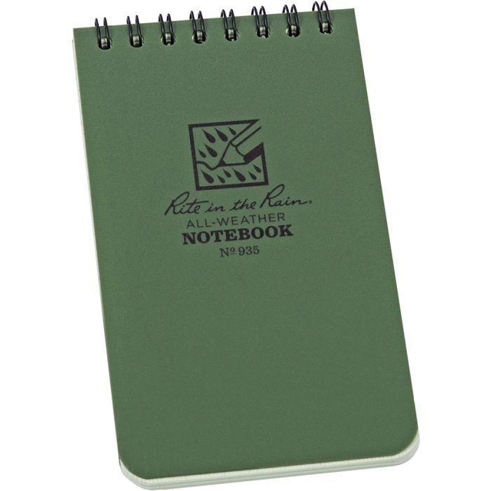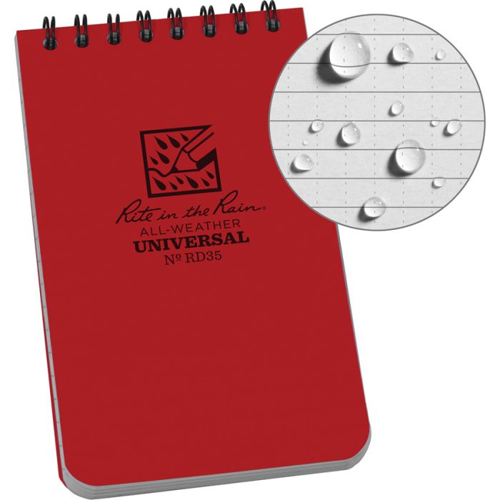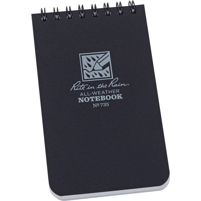 This 3" x 5" top spiral notebook features a durable black Poly dura cover and contains 50 sheets of gray Universal pattern Rite In The Rain paper. Designed for all-weather use, the moisture-resistant pages shed water, allowing you to write clearly in any environment—ideal for professionals who need reliable note-taking no matter the conditions.
